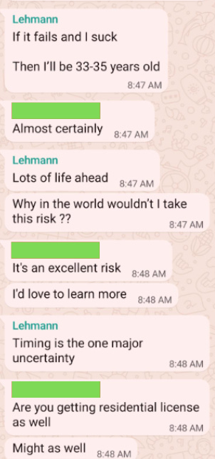 The real “binary outcomes?” You’re either alive or you’re not. So make it count. A lot’s happened since—leaving Wall Street, joining the brokerage, then starting my own consulting and brokerage brand, then moving to Amsterdam and working on what turned out to be a short-term corporate project, then setting up a new EU business and pivoting back to running my own consulting business today. The group chat kept me grounded all the way, stress-testing ideas and cheering me on. Your best friends should roast you to push you further but believe in you fiercely and wholeheartedly.