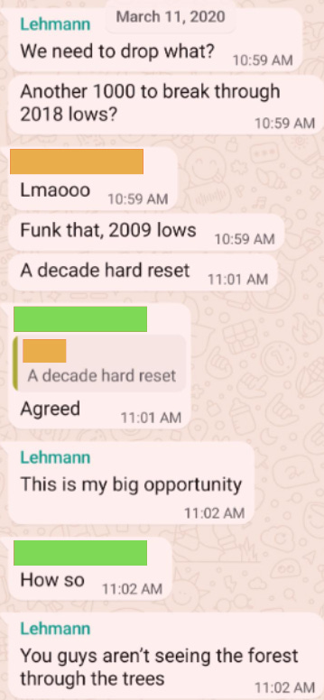 I was half-joking, half-serious—what are group chats for if not the occasional melodramatic rant? But the truth slipped through: I was ready to risk it all. The binary was clear—either the market would rebound, or we’d face bigger problems than money. I plowed our life savings into the market. Countless internal trade compliance approvals later, the Dow ultimately hit 30,000 by November 2020—up 60% from its lowest lows.