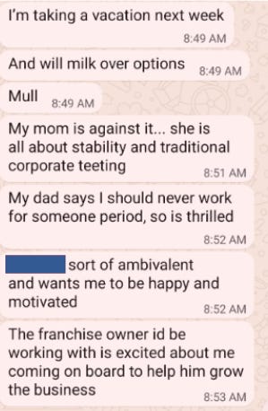 Peak momentum in my career, baby #2 on the way, just bought a bigger more expensive house. I’m days away from resigning, talking it out with my friends in the group chat.