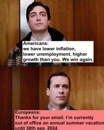 I remember the stress I had leaving my job in early 2021 in New York and talking to insurance brokers in New Jersey about setting up health insurance for my family of four. Including the inevitable deductible and out-of-pocket costs, it was about $2000/month. I can only imagine what this would cost today. Here? We pay about $300/month. Kids are free. The annual deductible is capped by law so low I won’t even say what it is. We also used to pay ~$20,000/year for a Montessori school. Here? It’s free. Combine those two major cost drivers — school and healthcare — with smaller things like more affordable and higher-quality groceries (partly due to higher private label penetration and investment i.e. less advertising and brand intensity), better and more reliable public transportation, mandated employer and government pension schemes, and far more favorable labor and income protections… I much better understand why Europeans can afford to be a bit more chill despite smaller incomes.