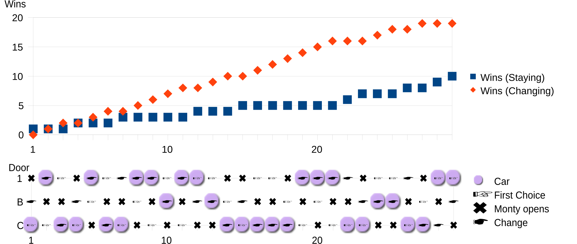 Now there are only two doors left. It’s 50/50 now. And my odds actually improved, so I’ll stick with my original pick.